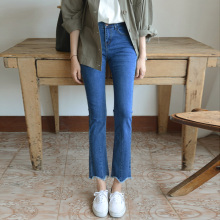 春装深蓝色紧身弹力中高腰撕边毛边韩版牛仔微喇裤子九分喇叭裤女