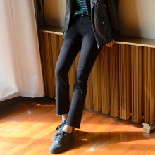 秋冬黑色弹力显瘦中高腰毛撕边韩版牛仔喇叭加绒加厚九分微喇裤女