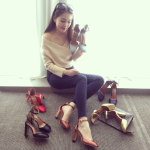 韩国单!2016春新款女鞋子优雅绸缎面一字扣带高跟鞋侧空粗跟单鞋
