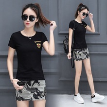 2017韩版夏季新款迷彩套装女显瘦短袖上衣短裤时尚休闲刺绣两件套