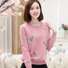 100%纯羊毛衫女套头圆领长袖打底衫保暖毛衣女秋冬针织衫绣花毛衣
