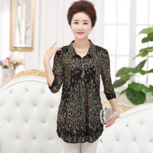 中年女装春装上衣雪纺衫妈妈装弹力网纱印花宽松大码衬衫新款