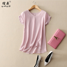 休闲宽松大码v领真丝短袖上衣女夏 短款 桑蚕丝 真丝上衣 t恤女