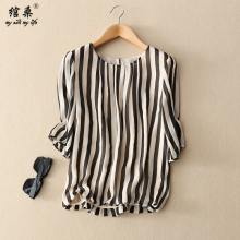 欧洲站 竖条纹圆领休闲大码真丝t恤五分袖女 夏 桑蚕丝 真丝上衣