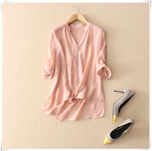 绾桑2017夏季新款女V领五分袖真丝衬衫重磅桑蚕丝T恤上衣宽松大码