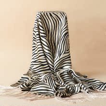 时尚斑马纹舒适双面真丝丝巾女素绉缎长款桑蚕丝围巾流苏百搭披肩
