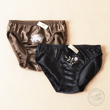 刺绣真丝内裤 女士透气舒适中腰桑蚕丝丝绸黑色三角裤 特价清仓