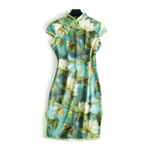 2017夏新款 绿色印花桑蚕丝真丝旗袍裙 改良日常短款短袖连衣裙子