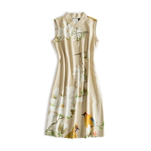 温婉优雅米色印花 桑蚕丝真丝绢纺旗袍裙 女夏季修身短旗袍连衣裙