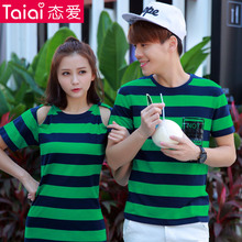 Taiai/态爱情侣装夏装韩版套装短袖t恤女条纹露肩学生海边度假潮