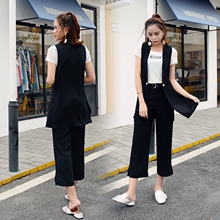禾苑2017夏装新款女装时尚韩版休闲气质三件套长马甲阔腿裤套装潮