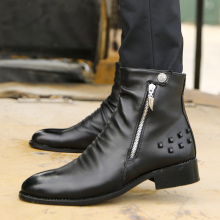 男鞋冬季韩版潮鞋保暖中筒靴男士马丁靴雪地靴尖头拉链真皮男靴子
