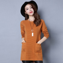 2016秋冬新款女装圆领中长款毛衣套头针织衫宽松显瘦带口袋打底裙