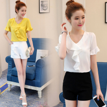 韩版女装夏季荷叶边短袖V领雪纺衫修身显瘦气质淑女百搭上衣小衫