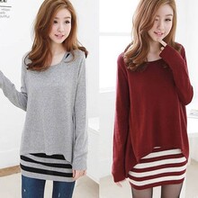 春装新款长袖T恤女上衣韩版大码宽松显瘦两件套长袖修身打底衫女
