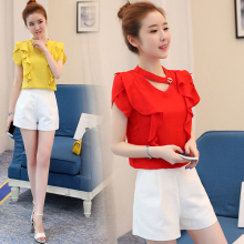 夏装女装2017新款韩版百搭短袖雪纺衫夏季喇叭袖上衣服荷叶边小衫