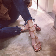 2017欧美新款细带组合方头粗跟百搭露趾一字扣显瘦凉鞋女夏高跟鞋