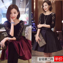 春秋款韩版显瘦短袖时尚蕾丝半袖女裙黑色a字裙晚礼服蕾丝连衣裙