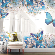 无缝壁画餐厅沙发电视背景墙纸3d立体空间延伸个性壁纸蓝色蝴蝶梦