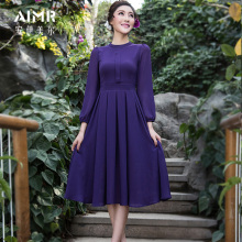 2016春夏季新款女装气质显瘦长袖大码雪纺超纯色中长款连衣裙百搭