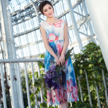 2016夏季修身印花色清新气质显瘦大摆长款雪纺连衣裙女百搭立体