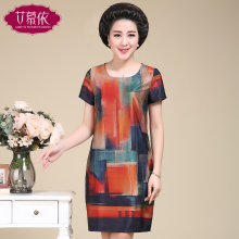 中老年女装中长款裙子40岁中年妇女妈妈装短袖大码雪纺连衣裙夏装