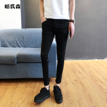 夏季弹力长裤紧身破洞牛仔裤九分裤男士韩版潮流乞丐裤小脚男裤子
