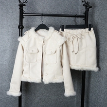 2017秋冬名媛气质修身双口袋毛毛拼接单排扣鹿皮绒系带短裙套装女