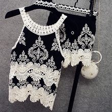 包邮!2017女新款蕾丝花边刺绣镂空背心上衣+松紧腰短裤休闲套装