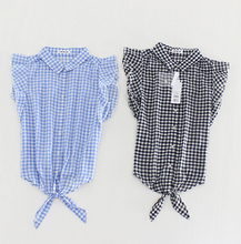 B051018 日单精品 两色入 清新小格纹荷叶袖兔耳朵系带短款衬衫