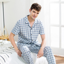 新款睡衣芬腾2017春夏季男士短袖长裤纯棉开衫家居服薄款全棉套装