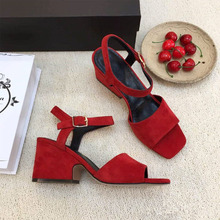 欧美2016夏季新品百搭皮带扣露趾女鞋粗跟高跟鞋一字带真皮凉鞋