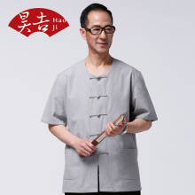 昊吉夏季男士短袖唐装上衣 中国风纯棉粗布改良唐装老人衣服