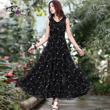 雪妃黛2017夏季连衣裙淑女显瘦刺绣大摆雪纺裙网纱长裙海边沙滩裙
