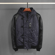 2016新品男装尼龙大身拼接头层山羊皮袖撞色连帽外套薄款棉衣男