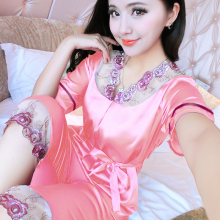 睡衣女夏款短袖中裤薄款丝绸性感仿真丝绸两件套装蕾丝冰丝家居服