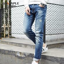 乔治枫叶牛仔裤男青年小脚裤破洞中腰弹力裤潮直筒韩版裤子男春季