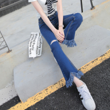 2017春装喇叭九分裤牛仔裤女 显瘦提臀弹力微喇裤破洞牛仔裤 潮