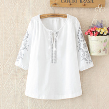 大码文艺女装棉麻短袖女上衣宽松韩版V领刺绣系带复古亚麻衬衣夏