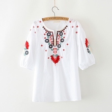 棉麻女装上衣t恤女民族风复古盘扣宽松刺绣文艺中袖亚麻料衬衣夏