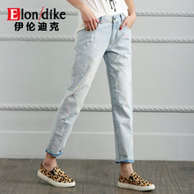 2016春夏哈伦膝盖破洞牛仔裤女潮宽松大码直筒BF风九分乞丐长裤子