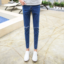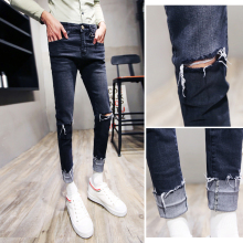 2017春夏新款韩版流行男裤猫爪磨破简约修身小脚牛仔九分裤男牛仔