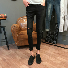 2017夏季新款男修身小脚裤男黑色膝盖破洞小脚九分裤男磨边破洞裤