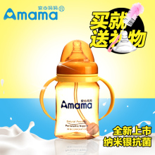 正品安心妈妈宽口径纳米银吸管带柄自动抗菌PP奶瓶300ml210ml弧形
