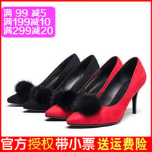 达芙妮2016秋细跟绒毛尖头高跟鞋毛毛球性感磨砂女单鞋1016404126