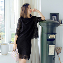 gagazhang2017春夏新款高腰五分袖裙子精致蕾丝镂空连衣裙女a字裙