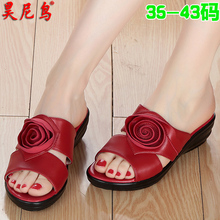 拖鞋女夏真皮花朵妈妈凉拖鞋中老年中年中跟凉鞋舒适百搭坡跟大码