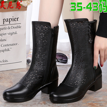 春夏女靴中跟真皮镂空网靴短靴鱼嘴透气单靴中老年防滑大码妈妈鞋