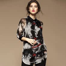 欧洲站2017春装新款宽松女装大码中长款桑蚕丝衬衣印花真丝衬衫女
