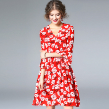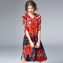 欧洲站2017春装新款宽松大码时尚印花V领桑蚕丝真丝连衣裙中长款